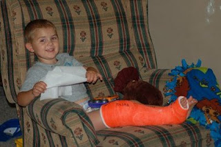 Zack took a fall off the futon and got a really great bruise on his chin. I took a picture, but our card reader isn't working, so I can't get it off the card just yet. We're really glad he wasn't hurt worse. He was bleeding in his mouth from somewhere, but there were no loose teeth or visible bites to his lips, so we think he may have bit the inside of his cheek.